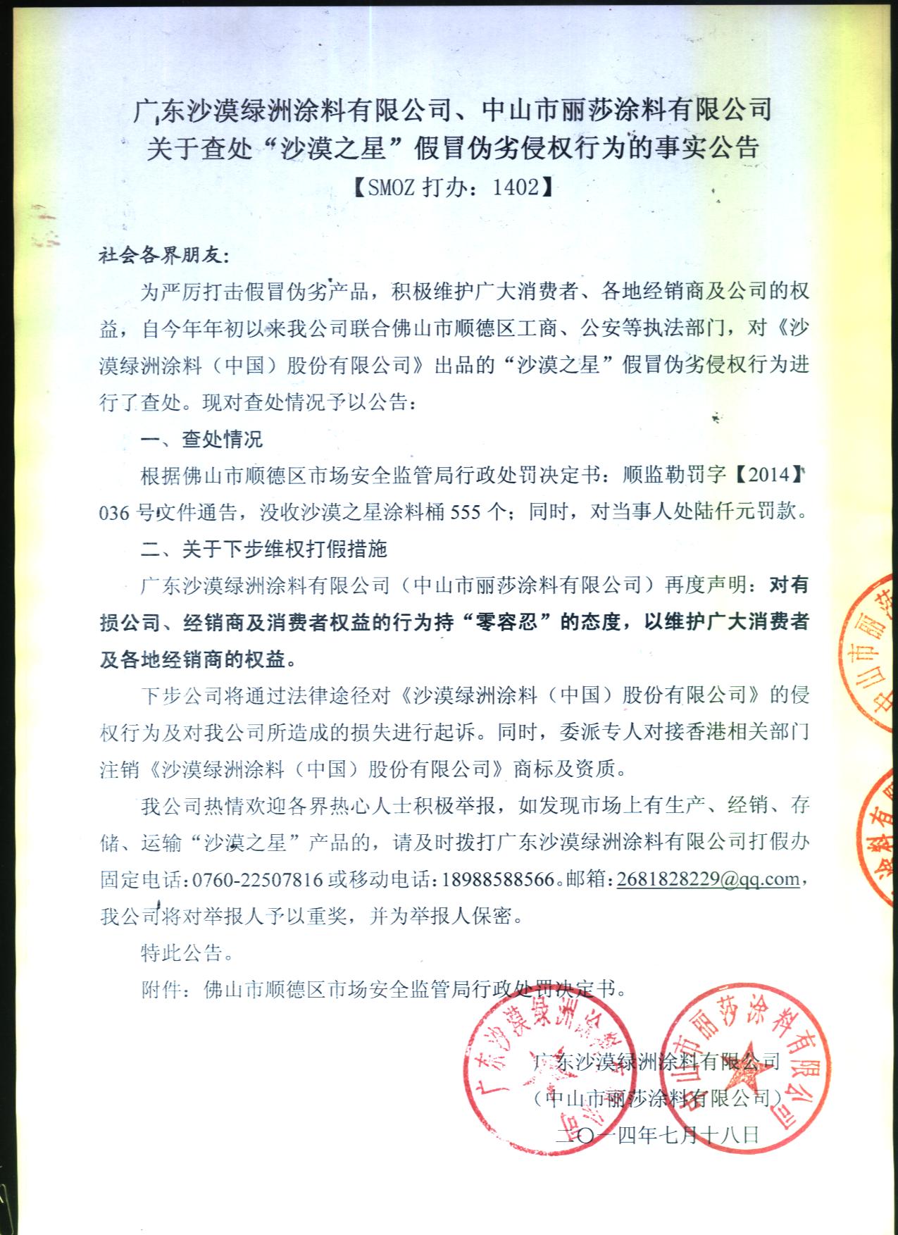 關(guān)于查處“沙漠之星”假冒偽劣侵權(quán)行為的事實公告